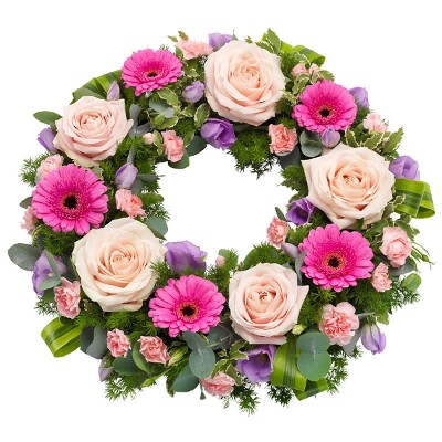 Du kannst deinen letzten Gruß nicht in Worte ausdrücken? Sag’s mit diesem besonderen Trauerkranz. Üblicherweise enthält der Kranz Blumen wie Rosen, Germini, Lisianthus, Nelken und saisonales Grün.
