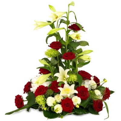 Ein letzter Abschied ist immer schwer, aber mit diesem gefühlvollen Trauergesteck mit weißen Lilien und roten Rosen machen Sie diesen letzten Gruß würdig! Unsere Floristen liefern das besondere Arrangement direkt zur Beerdigung.